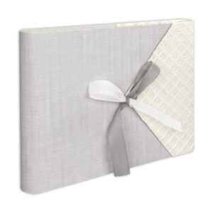 Album Busta 9, album fotografico grigio e bianco per foto da incollare, con pagine interne in cartoncino bianco e pagine protettive in carta pergamena, copertina in carta di riso e cotone, con fiocco decorativo in tessuto. Album da raccolta con 30 pagine, per custodire i tuoi ricordi e le tue foto preferite.COD: GH249 -