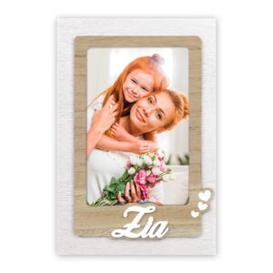 Cornice in legno, colore bianco con scritta ZIA a rilievo e decoro a forma di cuore.