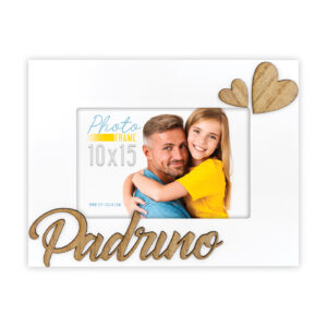 Cornice Padrino in legno, colore bianco, con scritta PADRINO a rilievo e decoro a forma di cuore in 3D, da tavolo.
