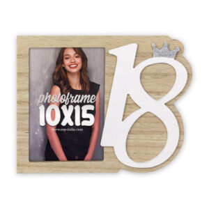 Cornice Taylor in legno, colore bianco e marrone, decoro traforato a rilievo a forma di numero 18, con coroncina glitterata, da tavolo.