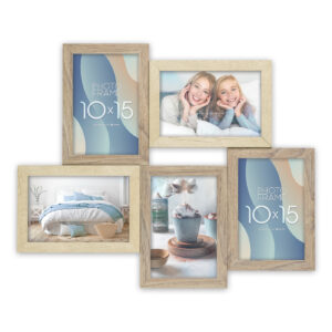 Cornice Oberg 5Q in legno, colore marrone e beige, multifoto da parete, formata da cornici orizzontali e verticali, per 5 foto, adatta per casa e ufficio.