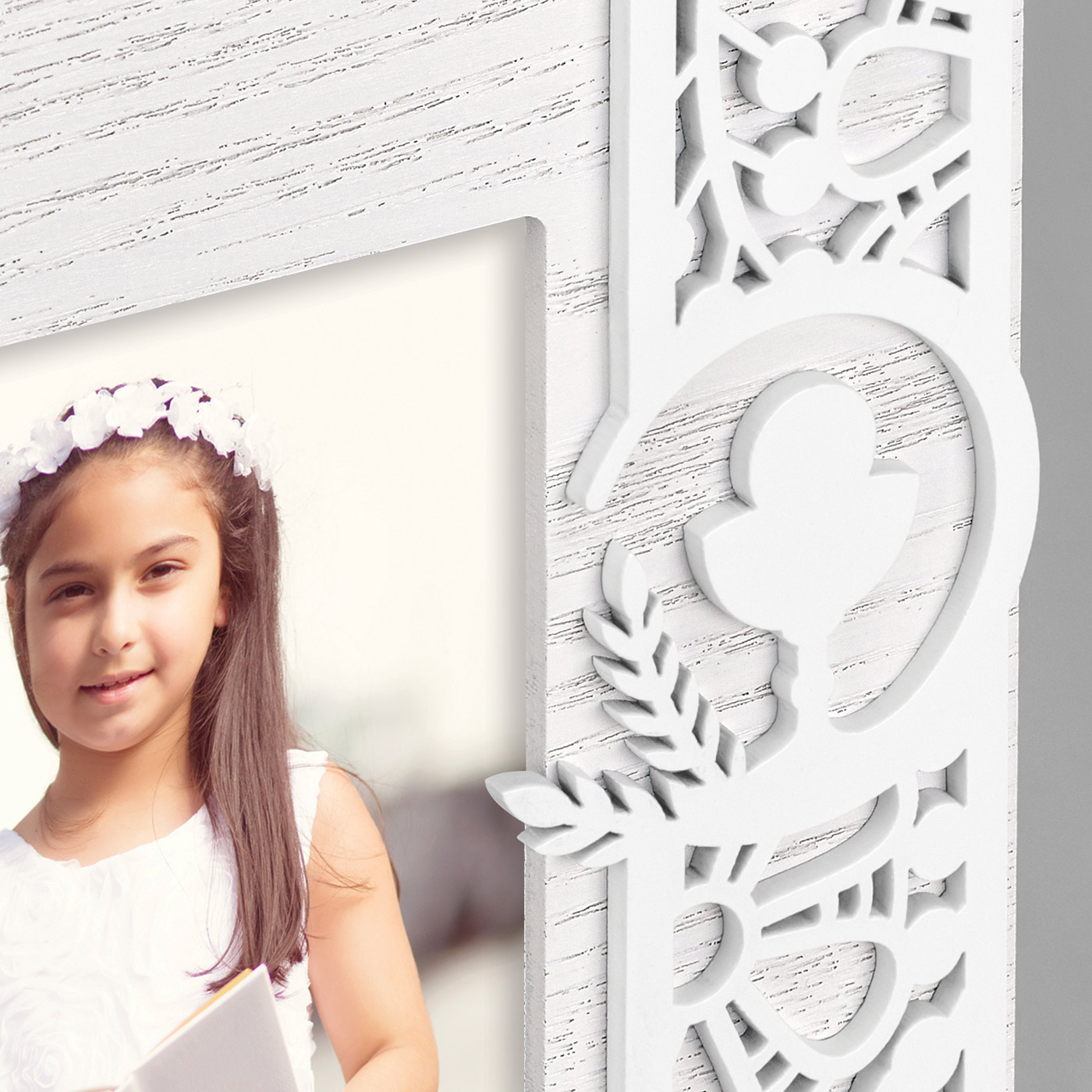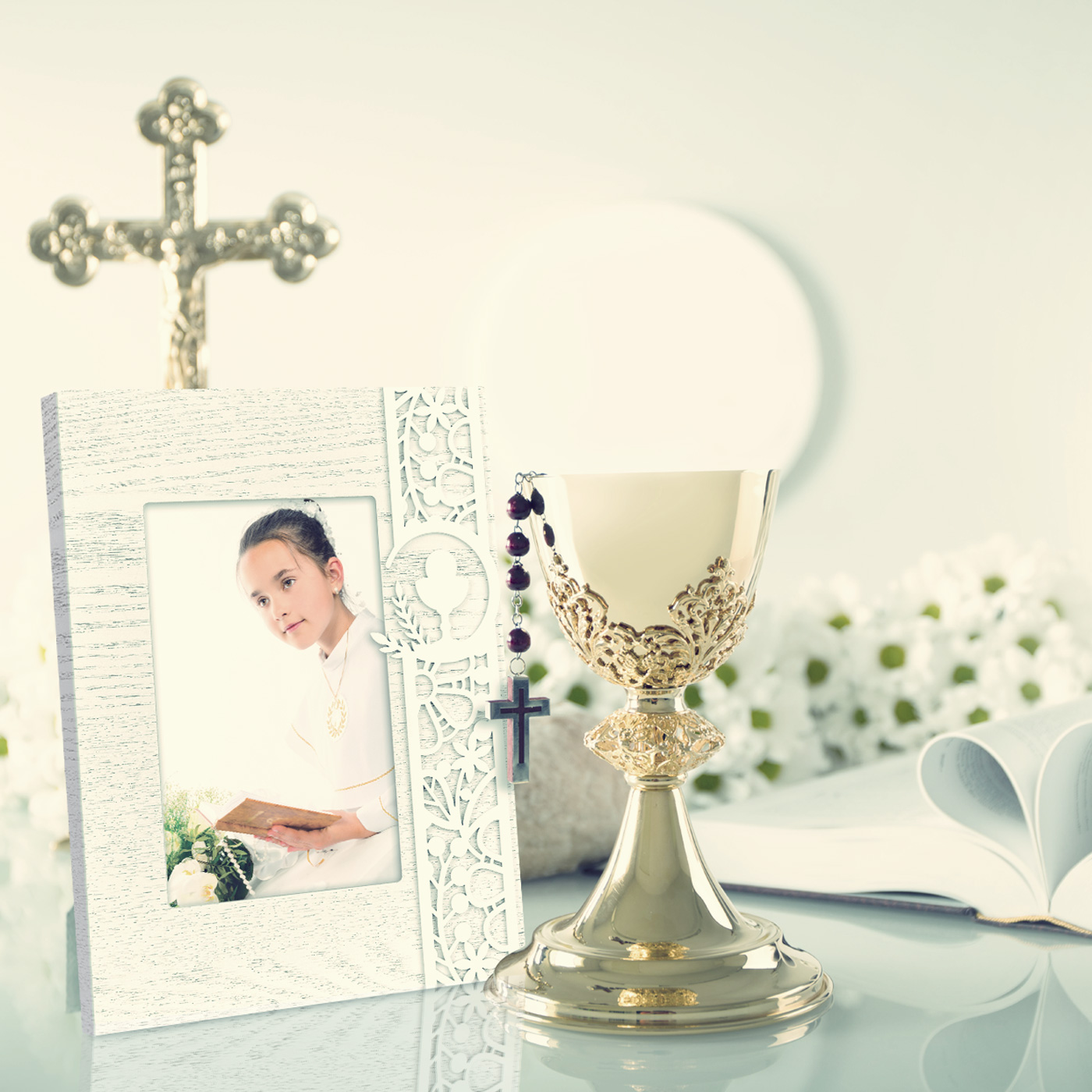 Cornice Emilia in legno, colore bianco, con decoro traforato in 3D fiori e calice, da tavolo, adatta al tema della comunione.